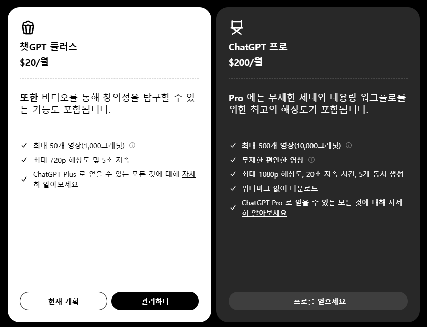 | ChatGPT Pro | $200 | 최대 500개 | 1080p | 제거 가능 |