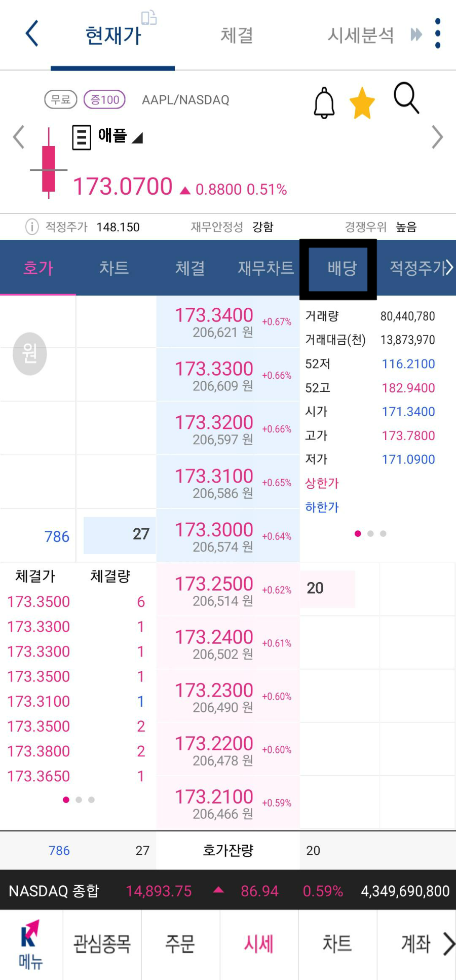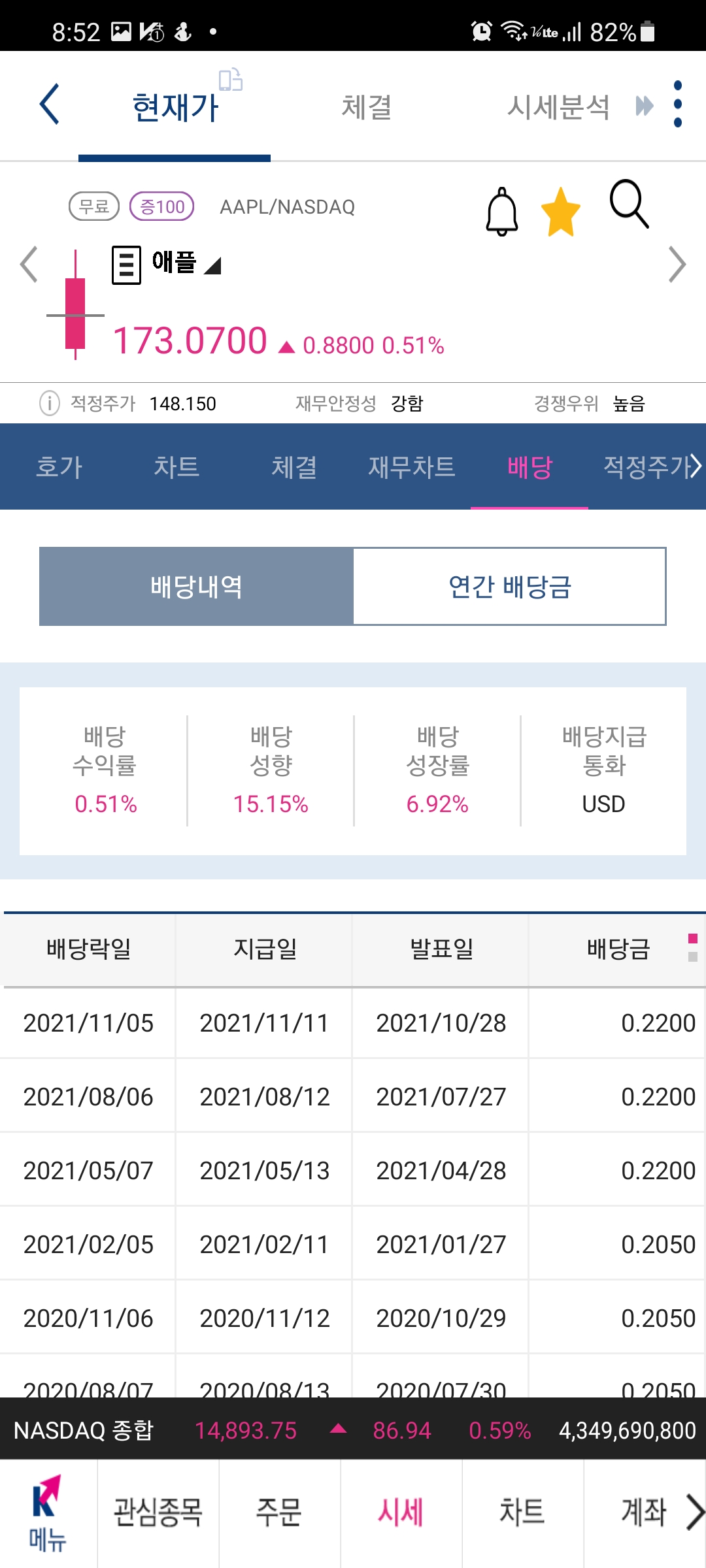 해당 종목의 배당 메뉴를 선택해 주시면 됩니다